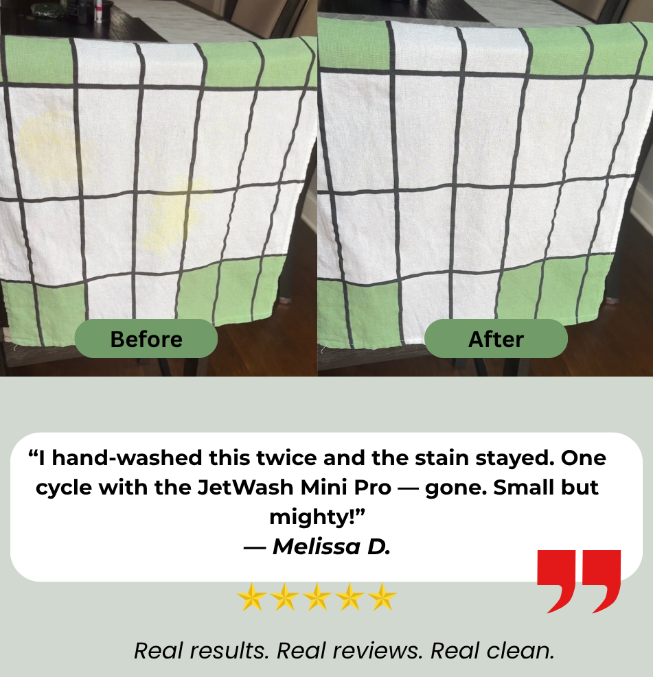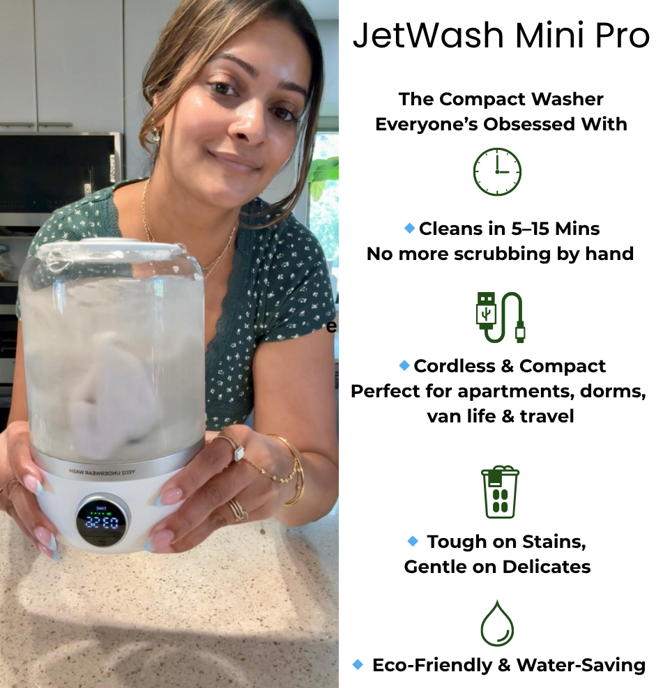 The JetWash Mini Pro is made for your busy, on-the-go life—easy to use, super convenient, and takes the stress out of laundry. Whether you're traveling, staying in a dorm, or just need a quick laundry fix without the hassle—this little powerhouse has your back.